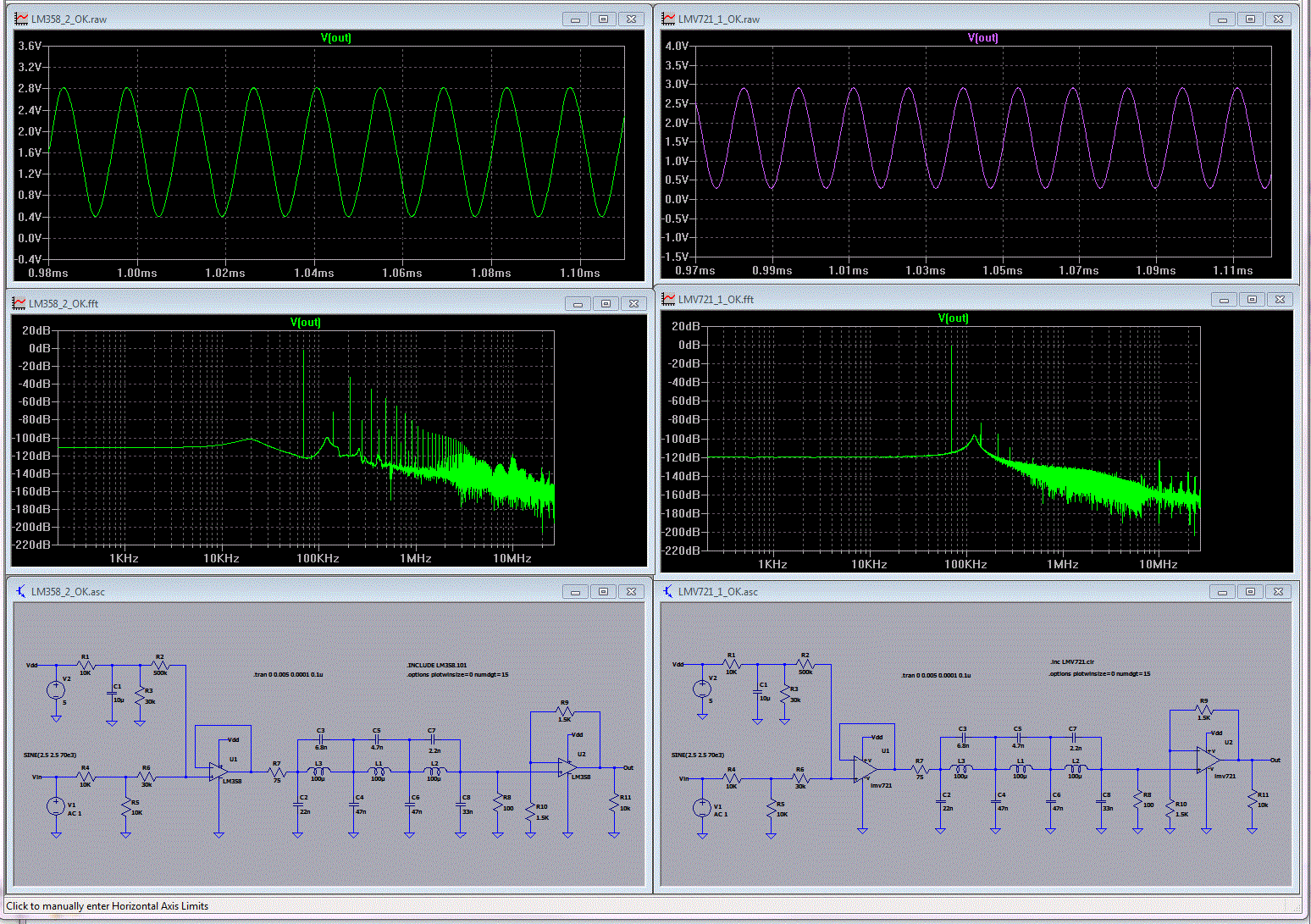 در این شکل مدار و شبیه سازی دو نوع از OP-AMP را توسط LTSpice میبینید.