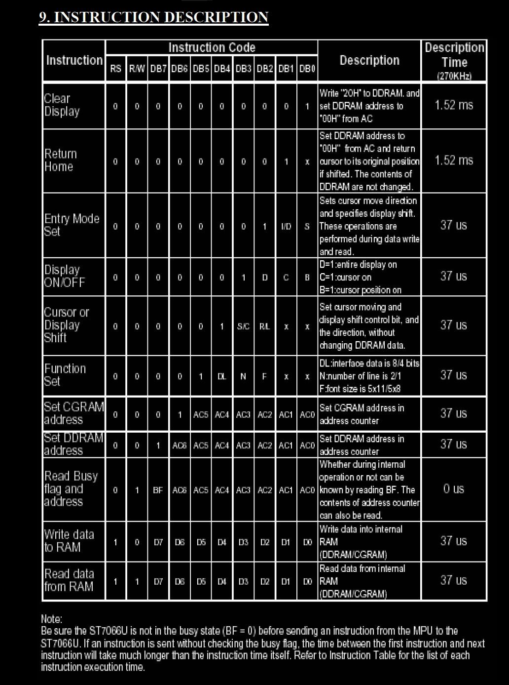 بغیر از 2 دستور بقیه دستورات را LCD در مدت زمان تقریبا 40 میکروثانیه انجام میدهد, یعنی اگر ما بعد از فرستادن یک بایت