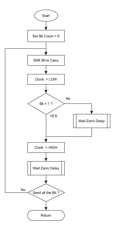 مقدار Delay را 6 در نظر میگیریم. با عدد 6 در مجموع, با احتساب ورود و خروج از تابع تقریبا 6,5 µS برای بیت صفر تاخیر ایچاد میکنیم.